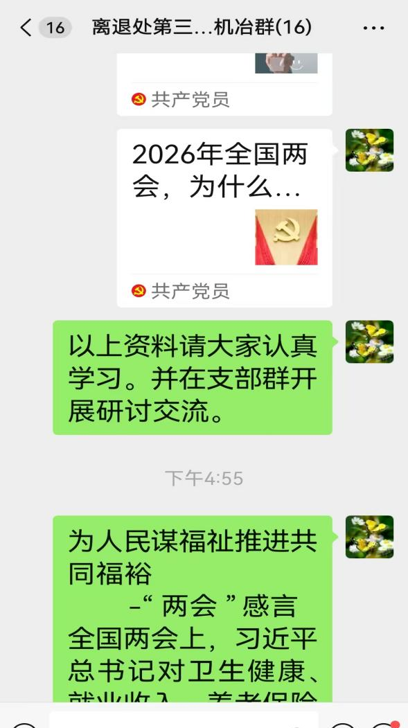 支部书记在群内分享了政府工作报告要点、两会相关解读文章及视频资料,引导老同志们原原本本学、联系实际思。老同志们积极响应,迅速投入到学习交流中。讨论中,老同志们紧扣两会精神,结合自身经历和所见所闻,畅谈国家发展新成就,特别是民生领域的积极变化。大家普遍认为,今年的两会高度关注民生福祉,推出了一系列务实举措,如“多渠道增加城乡居民收入”“推进建立长期护理保险制度”“完善‘三孩’生育政策配套措施”等政策,让“一老一小”更有保障,人民群众的获得感、幸福感、安全感更加充实。