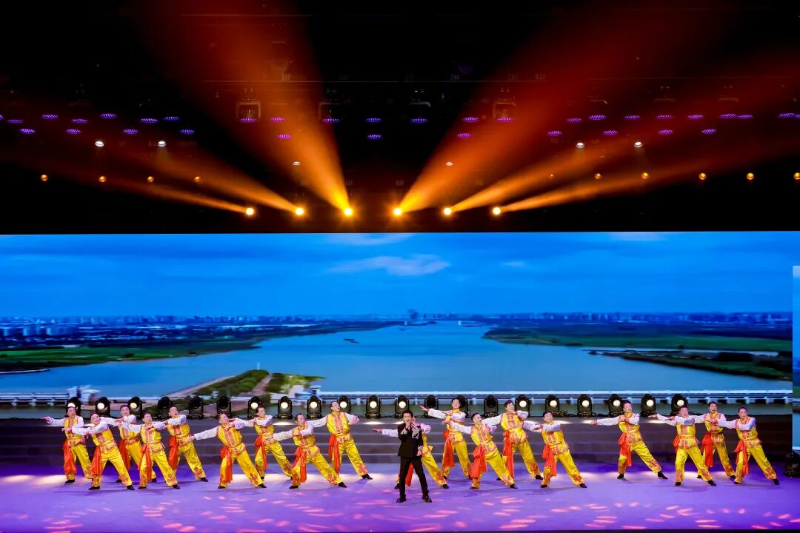 节目《我的淮河》是由18名清一色男演员组成的参演阵容,他们平均年龄近70岁。在舞台上身着金黄色演出服的“淮河汉子”们步伐铿锵,舞蹈编排巧思尽显 —— 既复刻出淮河浪花奔涌的灵动姿态,又融入蚌埠花鼓灯的独特地域韵律,与歌曲中淮河儿女的豪迈情怀完美契合。